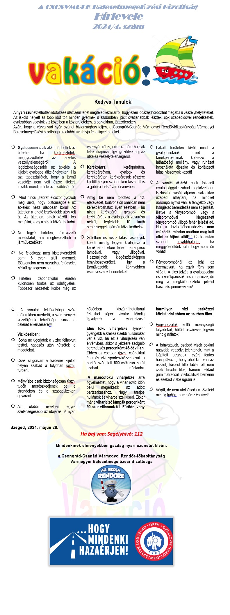 A CSCSVMRFK Balesetmegelőzési Bizottság Hírlevele 2024/4. szám Közzétéve 2024-05-29 Szerző: csernakne